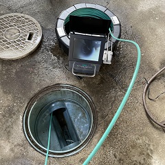 「屋外排水管のつまり」とのことで現場状況を確認しました。汚水管のつまりで2階から1階に降り、最終桝に行くまでの間でつまっていました。早速、高圧洗浄作業開始です。水に溶けない異物がつまっていたわけでは無かったため、無事つまり除去ができました。排水テストまでしっかりと行い、作業完了です。