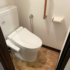 古くなって水漏れしている便器を交換してほしいとのご依頼で、トイレリフォームを行いました。隅付タンクのトイレでスペースが狭いため、狭いスペースに設置可能なロータンク式のトイレをご提案。床はそのまま利用し、壁は隅付タンクの跡が残るため砂壁の一部に板を張りクロス仕上げいたしました。